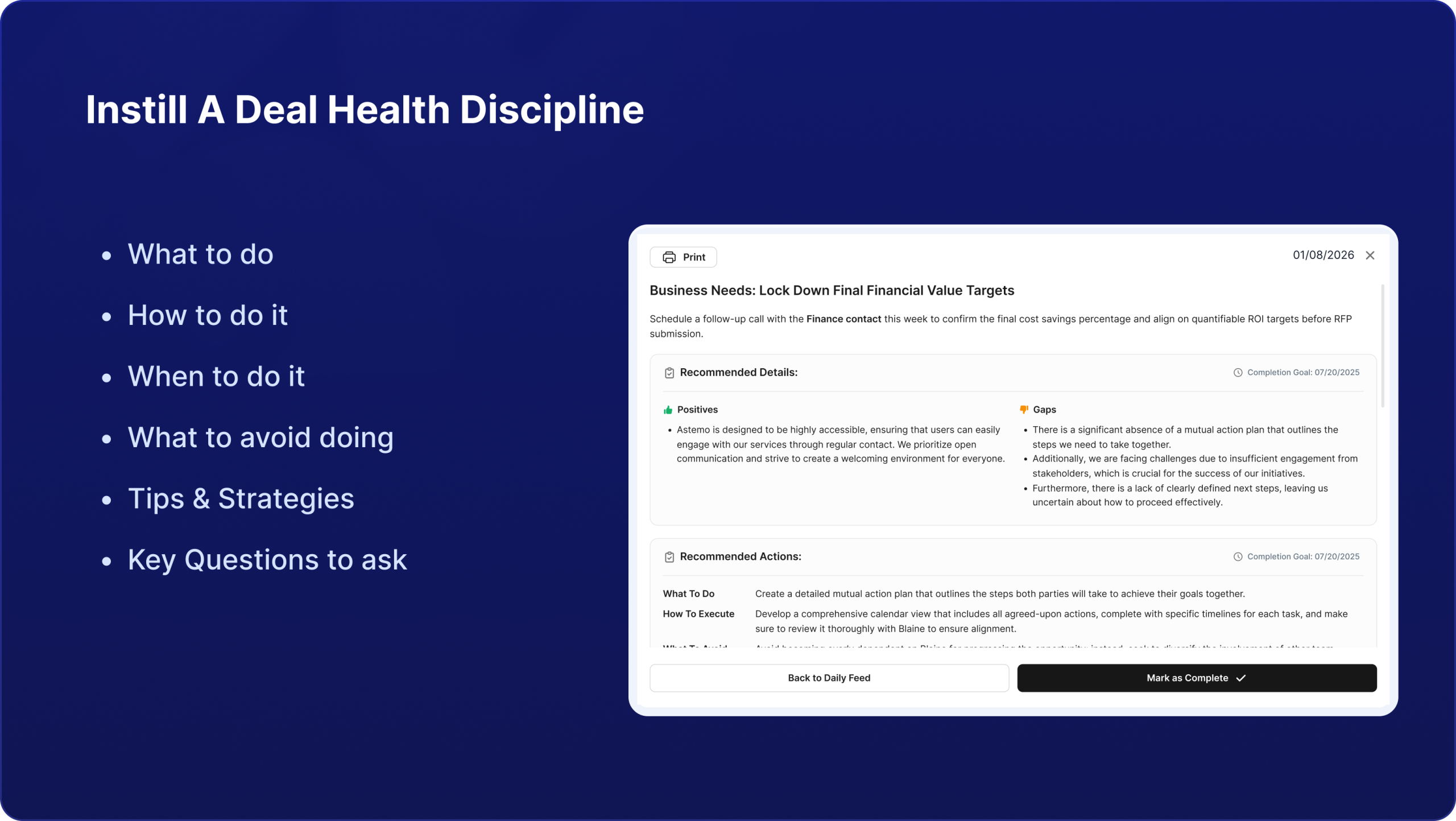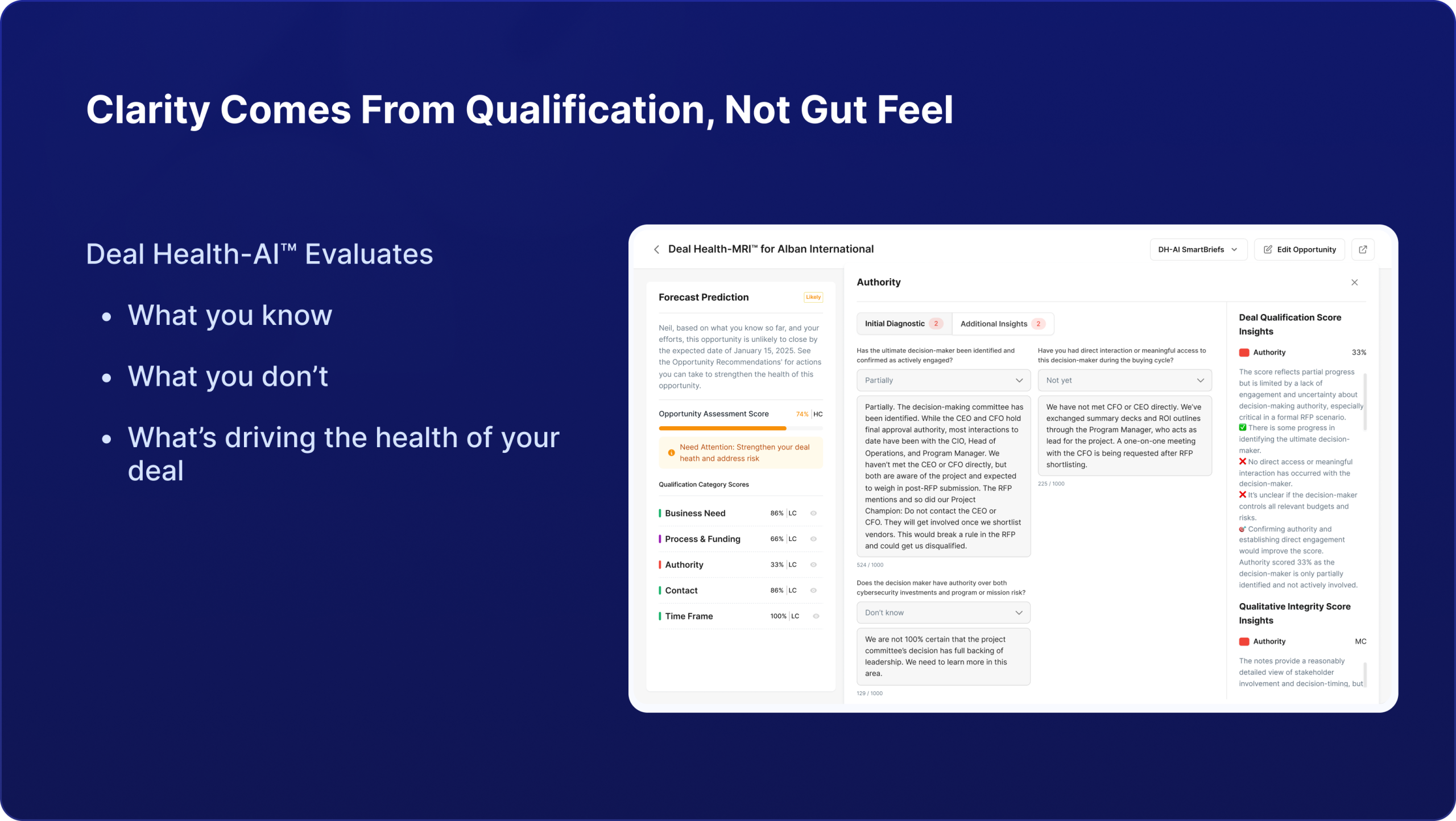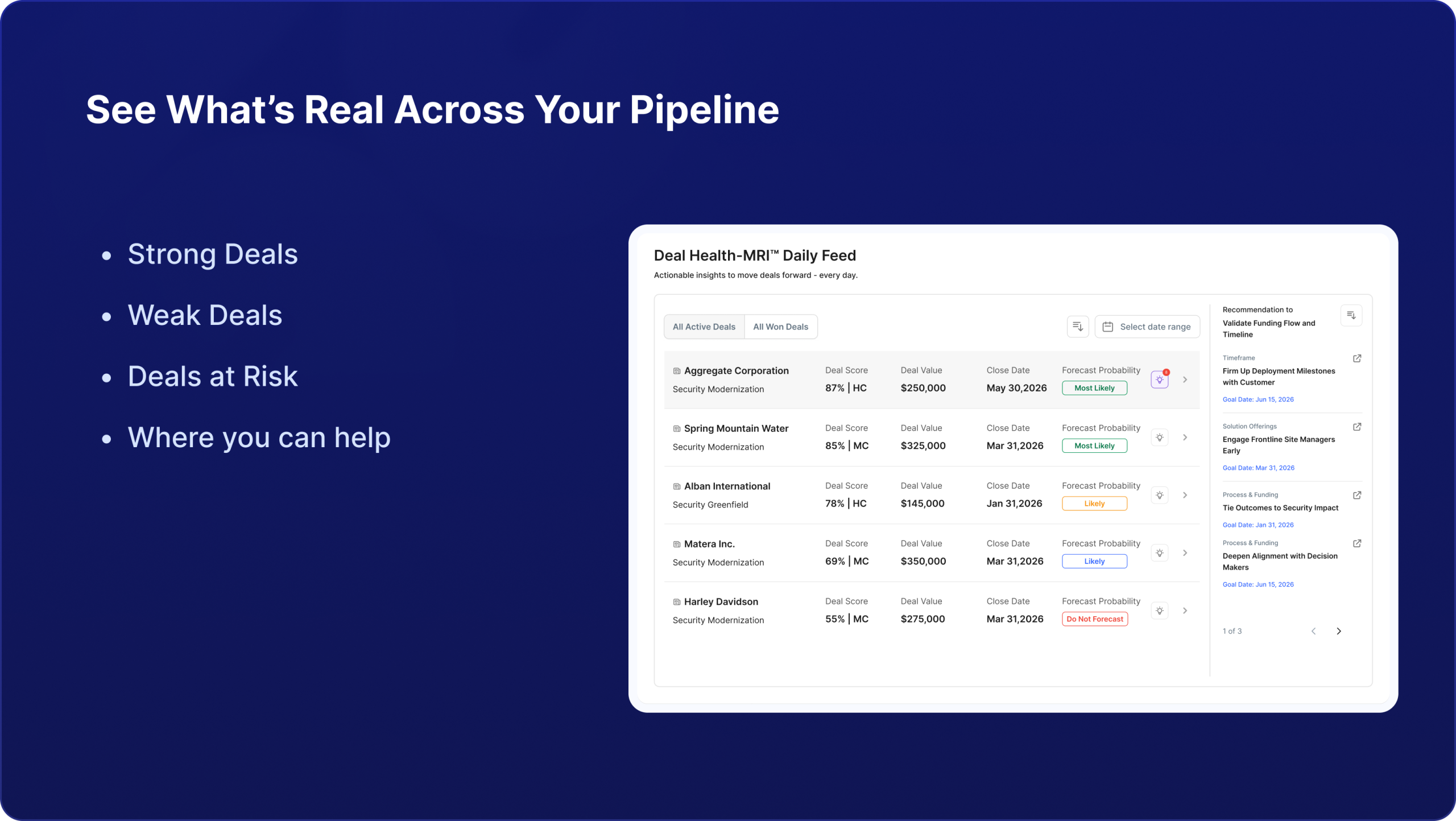Our Deal Review Summary gives managers the real truth behind every deal – qualification strength, risks, AI-driven recommendations, and forecast probability – all in one click.