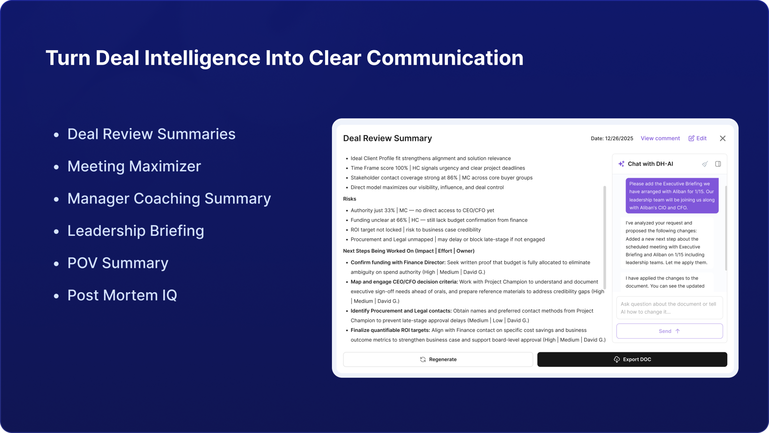 Watch how Deal Health-AI™ spots risks, prescribes next steps & turns your pipeline into a source of confident, winnable deals. It’s fast, it’s clear, and it will change the way you qualify, sell, and close.