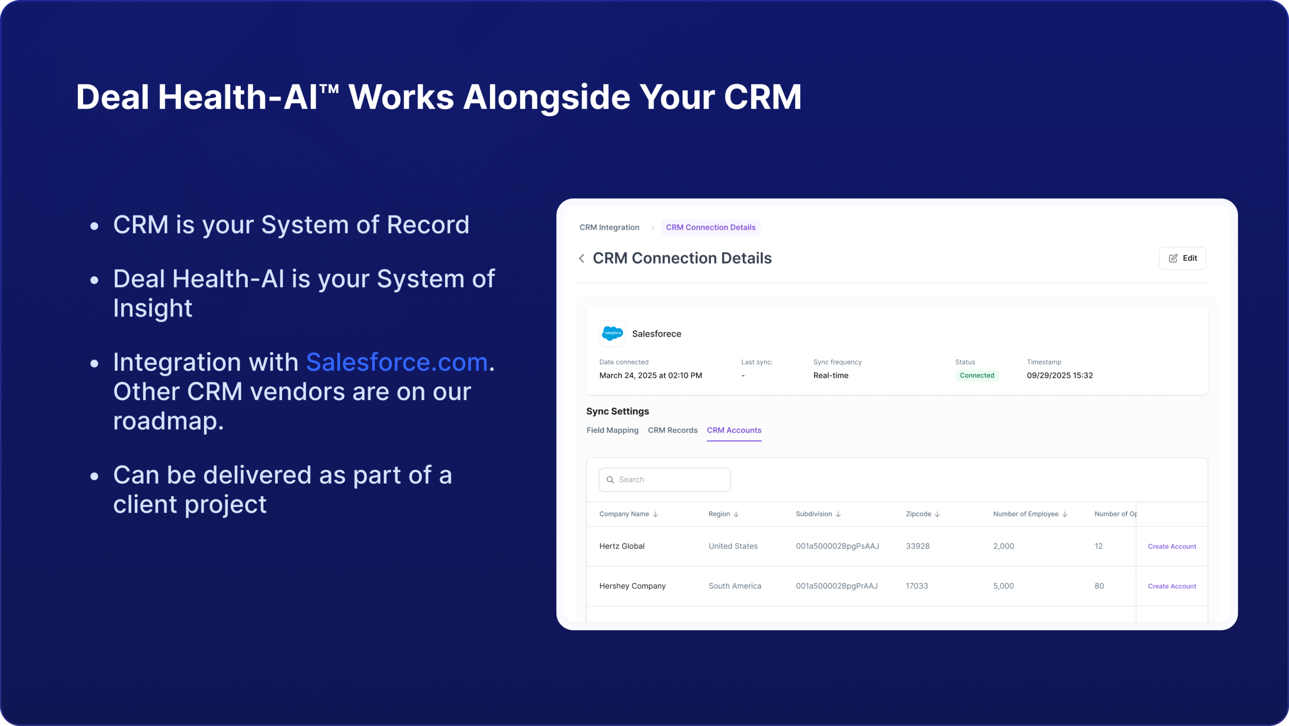 Deal Health-AI™ integrates seamlessly with your CRM and analytics stack to elevate deal visibility without disrupting how your teams work. Salesforce accounts and opportunities sync automatically for real-time analysis.