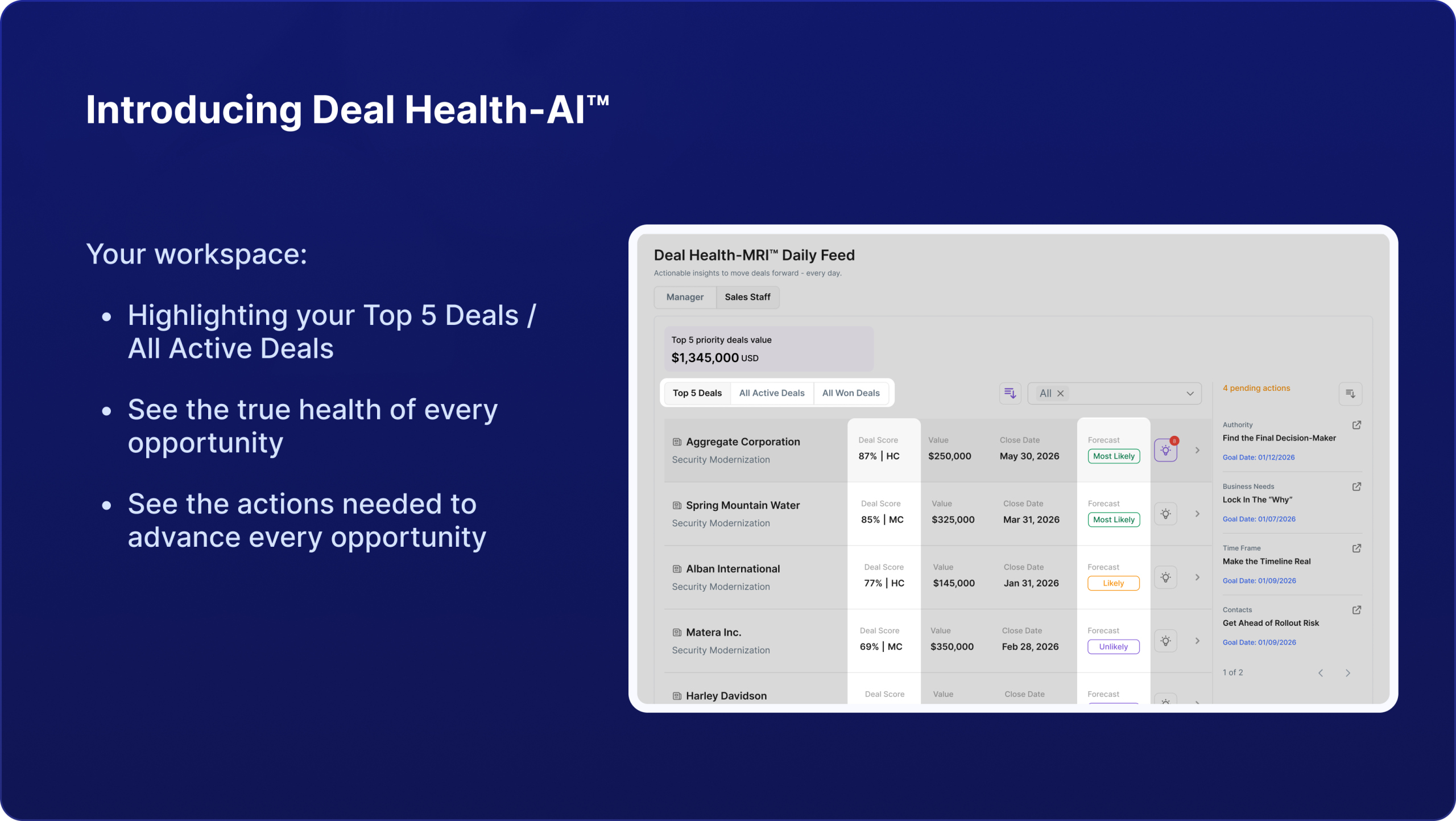 Deal Health-MRI™ delivers an AI-powered diagnosis of each opportunity, revealing what is working, what is at risk, and what actions are required next.
